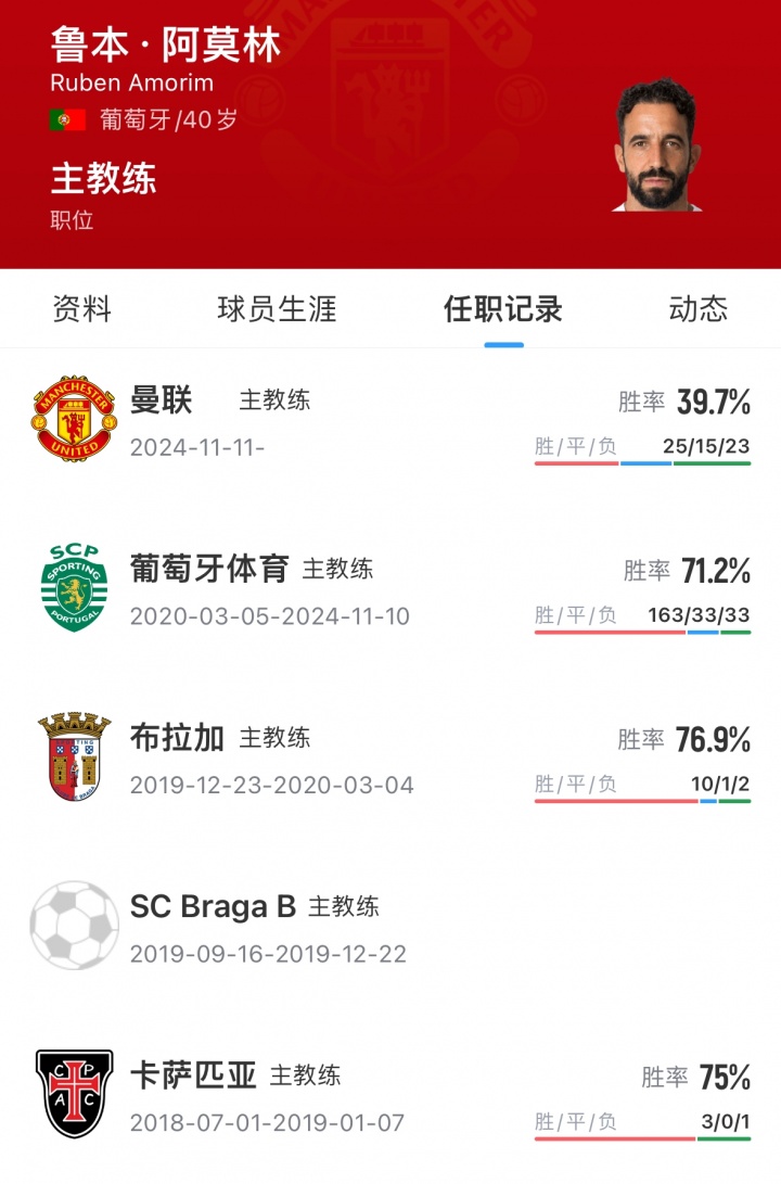 2024年11月,阿莫里姆出任曼联主帅,率队取得25胜15平23负。球队一年的胜率还不到40%。曼联目前在本赛季英超联赛中排名第6。